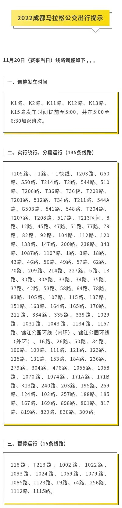 公交:赛事当日(11月20日),6条快速公交线路提前至5:00发车,135条线路实行绕行、分段运行,15条线路暂停运行。