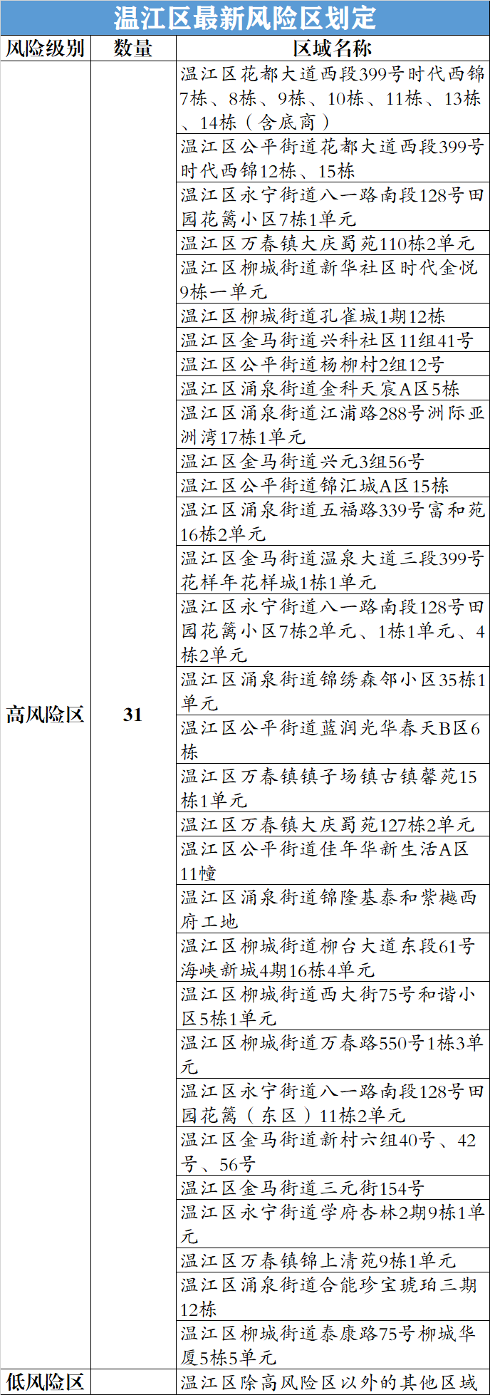按照国务院应对新型冠状病毒肺炎疫情联防联控机制综合组《新型冠状病毒肺炎防控方案(第九版)》《关于进一步优化新冠肺炎疫情防控措施科学精准做好防控工作的通知》的规定和市区专家综合评估,经成都市温江区新型冠状病毒肺炎疫情防控指挥部研究决定:自2022年12月4日起,将温江区天府街道学海路88号中铁丽景书香26栋 (含楼下底商)、中铁丽景书香21栋2单元,温江区公平街道品润金樽府3栋的风险等级由高风险调整为低风险。