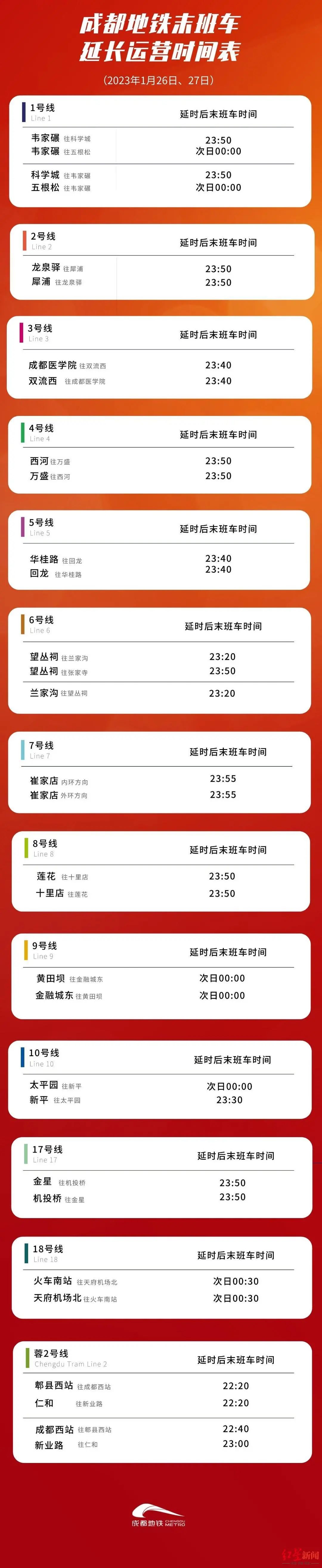 据成都轨道集团消息,目前,成都轨道交通线网单日客运量正在逐步回暖,累计客运量已经突破95亿乘次。预计春运期间成都地铁客流分布总体呈现出“U”字型,即两头高、中间低的分布趋势。结合市民夜间出行及返程的需求,大年初五(1月26日)、初六(1月27日),成都地铁各线将延长运营服务时间50-60分钟。
