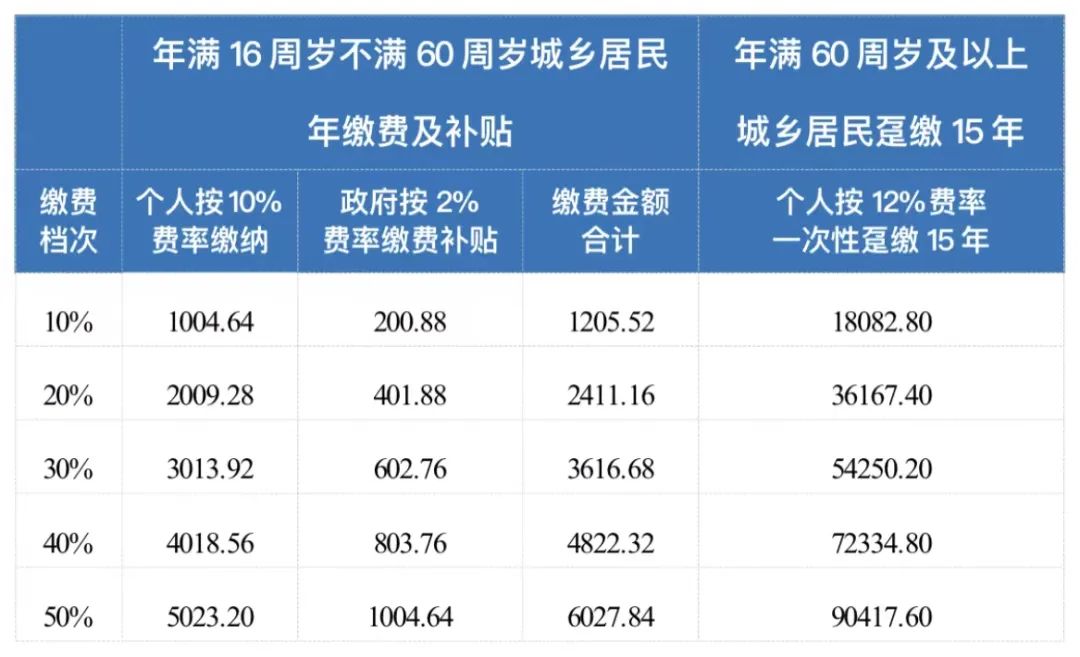 1.农村居民缴费档次为10%档至50%档,城镇居民缴费档次为40%档和50%档。