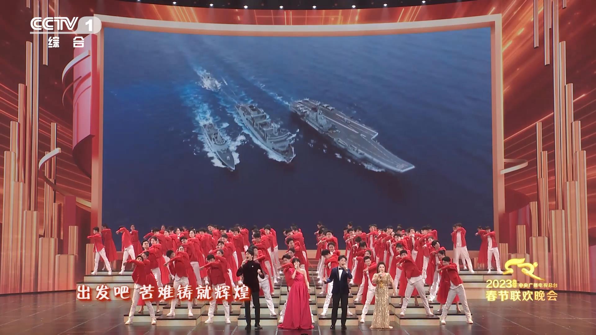 在《远征》铿锵有力的歌声中,观众看到画面中出现梦天实验舱成功发射和对接、中国空间站全面建成、陆军2022年开训动员、辽宁舰航母编队、2022珠海航展“运-20”起飞等一系列激动人心的瞬间,汇聚起继续前进的磅礴伟力。