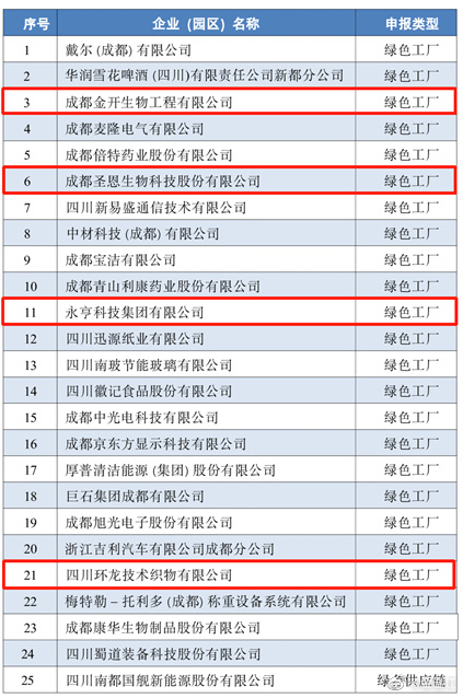 日前,记者从四川省经济和信息化厅网站获悉,2022年省级绿色制造名单正式公布,全市共24家企业获评绿色工厂。金开生物工程有限公司、成都圣恩生物科技股份有限公司、永亨科技集团有限公司、四川环龙技术织物有限公司4家温江企业上榜,约占全市16.67%。(温江融媒)