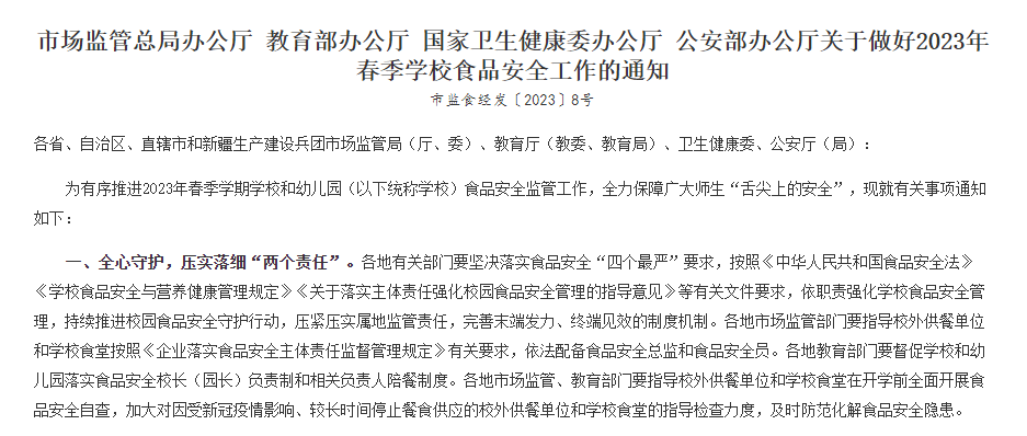 随着各级各类学校陆续开学,师生“舌尖上的安全”备受关注。市场监管总局、教育部等四部门日前发文部署2023年春季学期学校食品安全监管工作,明确中小学校、幼儿园原则上不在校内设置小卖部、超市,学校周边不得设置售烟、售酒网点。各地将严肃查处学校及周边、网络平台等面向未成年人无底线营销食品等违法违规行为。