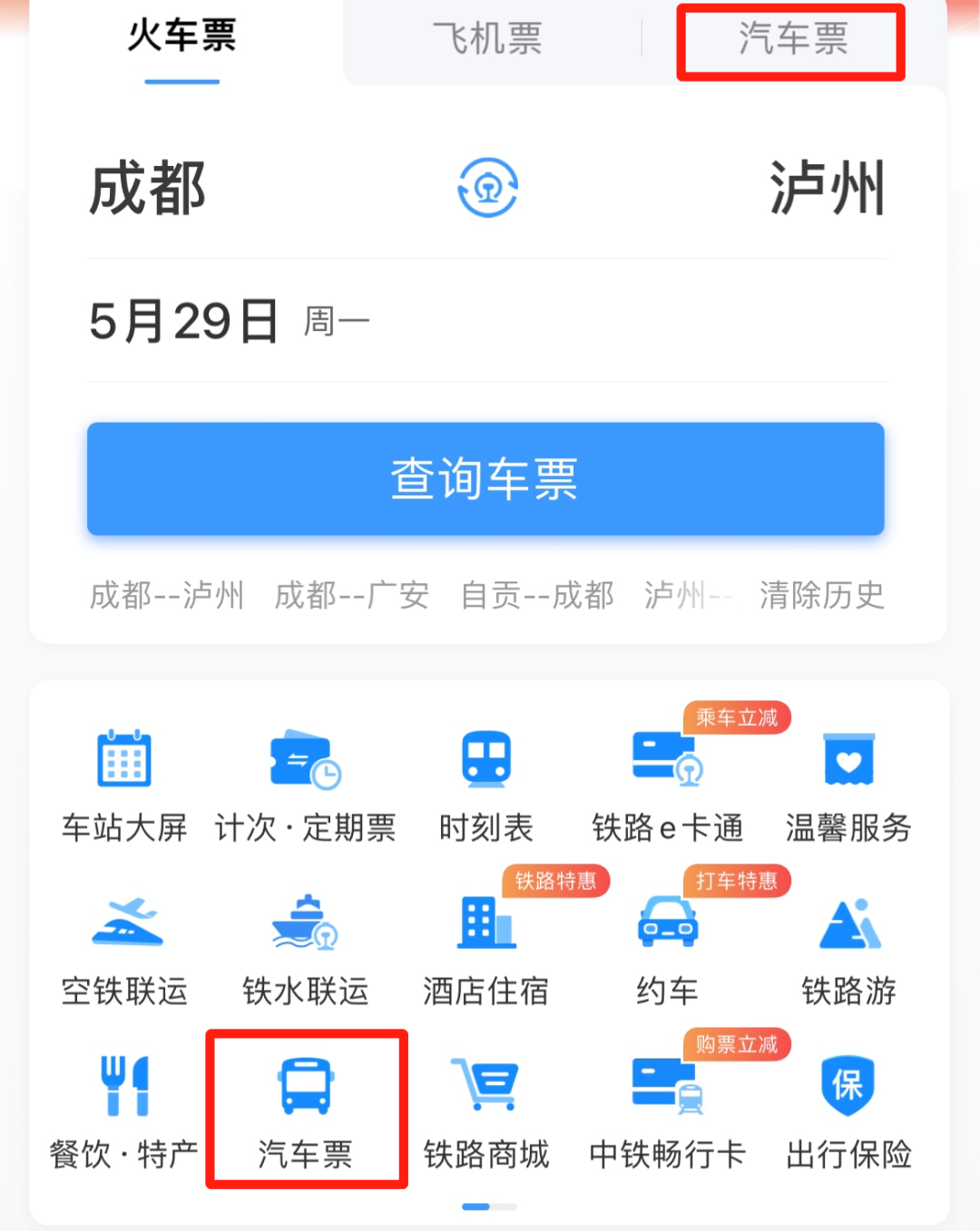 打开铁路12306APP,点击首页“汽车票”进入汽车票服务专区。
