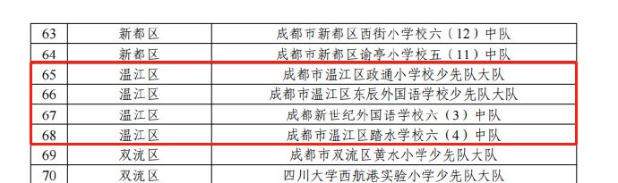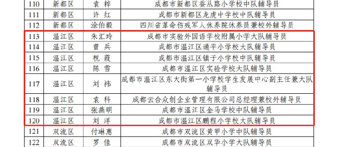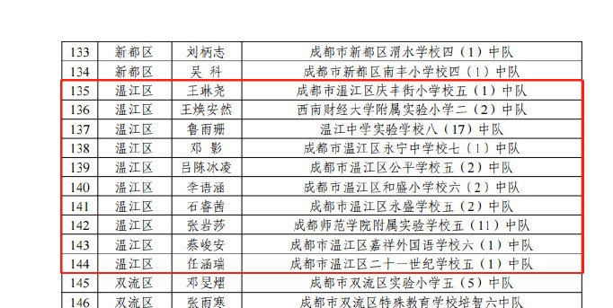 近日,团市委、市文明办、市教育局、少先队成都市工作委员会联合印发了《关于表扬2022—2023年度成都市优秀少先队员、优秀少先队辅导员、优秀少先队集体的通报》,决定授予董瑞希等234名少先队员“成都市优秀少先队员”称号,授予牟超等188名少先队辅导员“成都市优秀少先队辅导员”称号,授予四川天府新区第三小学少先队大队等113个少先队集体“成都市优秀少先队集体”称号。温江区9名少先队员、8名少先队辅导员、4个少先队集体榜上有名↓↓(温江融媒)