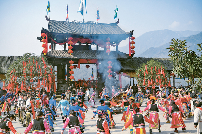 2023年1月18日,四川省北川县石椅村村民跳起“沙朗”,欢庆新年。 C视觉供图 杨树/摄