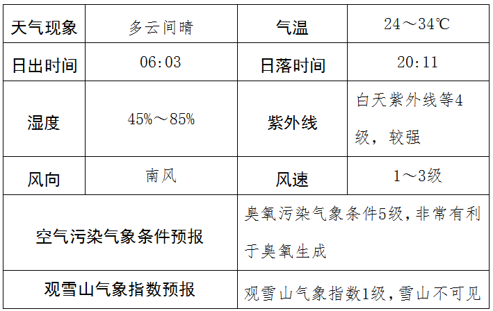 6月26日,预计我区多云间晴,晴热天气继续,白天紫外线强,外出还需注意防晒补水。早间最低气温24℃左右,白天最高气温34℃左右。