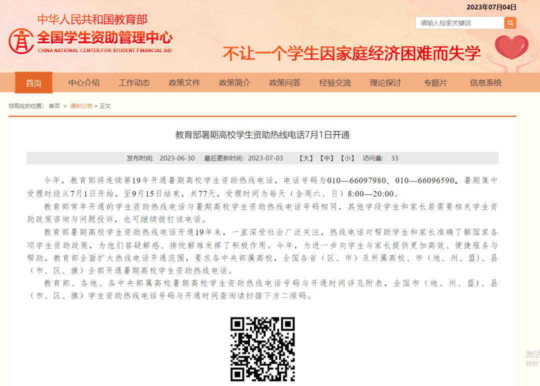 教育部、各地、各中央部属高校暑期高校学生资助热线电话号码与开通时间详见附表,全国市(地、州、盟)、县(市、区、旗)学生资助热线电话号码与开通时间查询请扫描下方二维码。