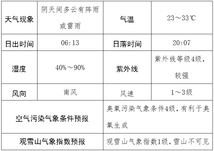 7月19日(周三):多云间阴有分散阵雨,气温23~33℃;