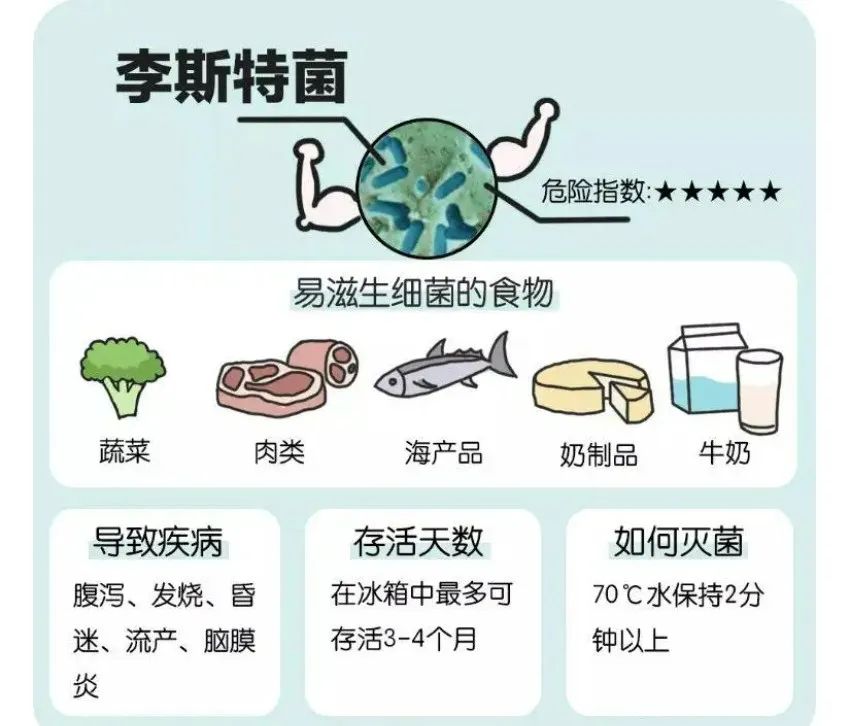 在这些细菌中,最令人头疼的当属李斯特菌,它除了会引起发烧、腹泻、孕妇流产之外,还会引发脑膜炎和败血症。因此,老年人、孕妇和慢性病患者等免疫力较差的人群尤其要注意。