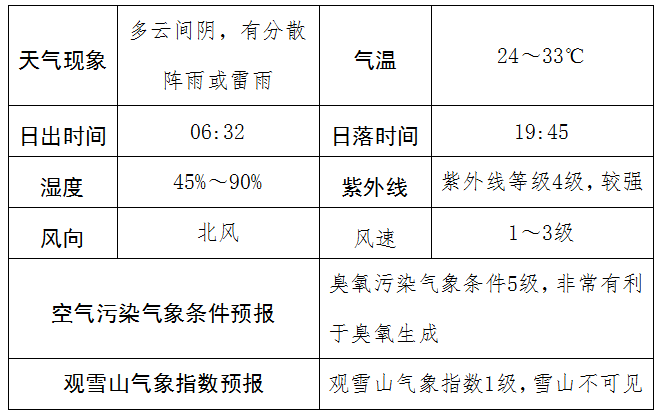 8月19日(周六):多云间阴,有阵雨或雷雨,个别地方大到暴雨,气温25~33℃;