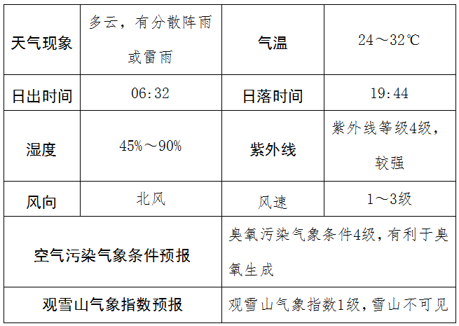 8月19日(周六):多云间阴,有阵雨或雷雨,个别地方大雨,气温24~32℃;