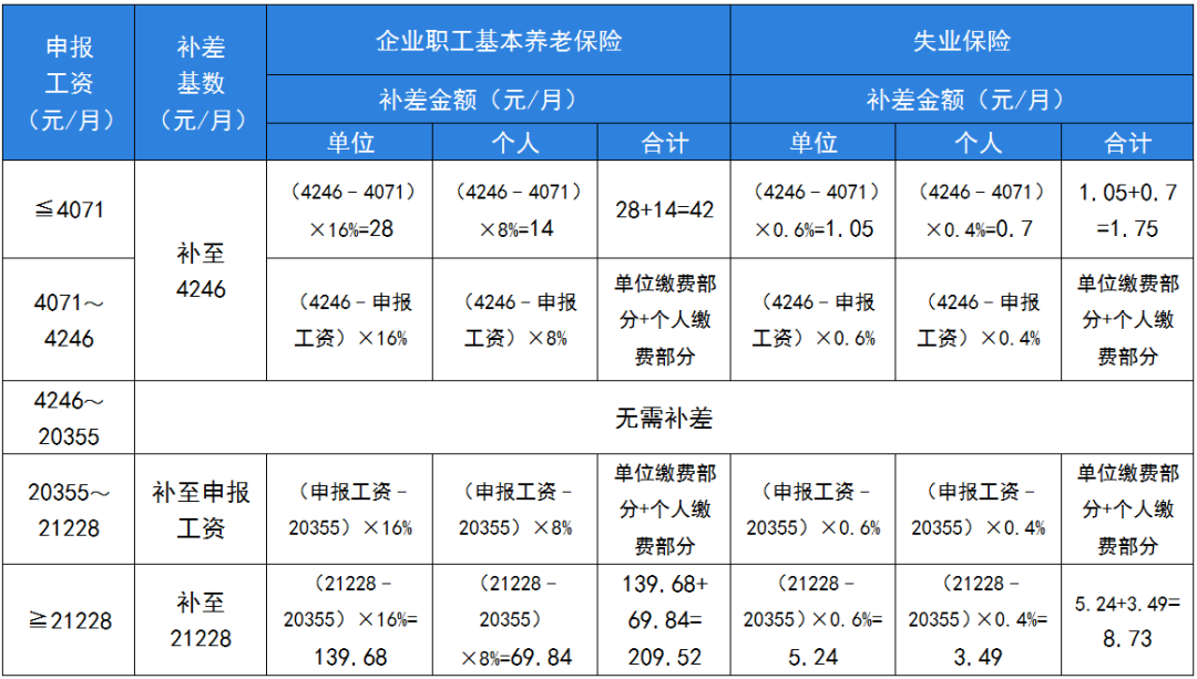 1.2023年1-7月已按2022年社保缴费基数下限4071元/月缴费的,2023年1-7月养老保险缴费基数、4-7月失业保险缴费基数补至4246元/月;
