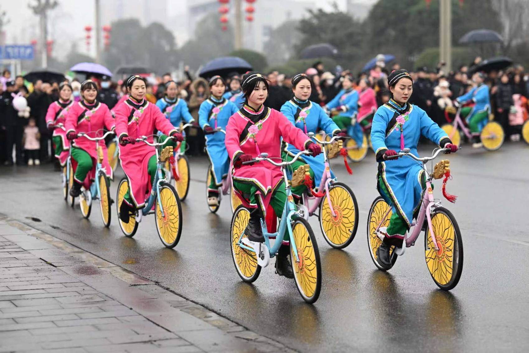 如今,绵竹更是以年画为载体,推出了一年一度的绵竹年画节,让观众可以在参观、游览中更全面地感受年画魅力与年节氛围。在今年2月2日开幕的第二十三届绵竹年画节上,身着绵竹年画特色服装的民俗巡游,让观众现场感受年画“动”起来:威风凛凛的龙狮锣鼓表演、绵竹年画《报春图》的再现、骑车仕女巡游、老鼠嫁女等精彩纷呈的表演令人目不暇接。其中,风靡全网的《科目三》舞蹈与传统年画相结合的表演更是引起现场围观群众的阵阵欢呼。