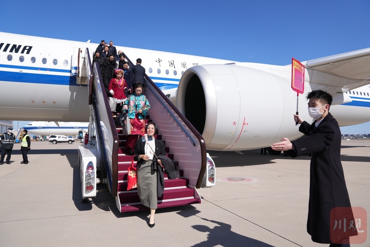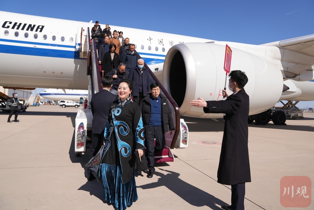 出席十四届全国人大二次会议的四川代表团乘机抵达北京首都机场。