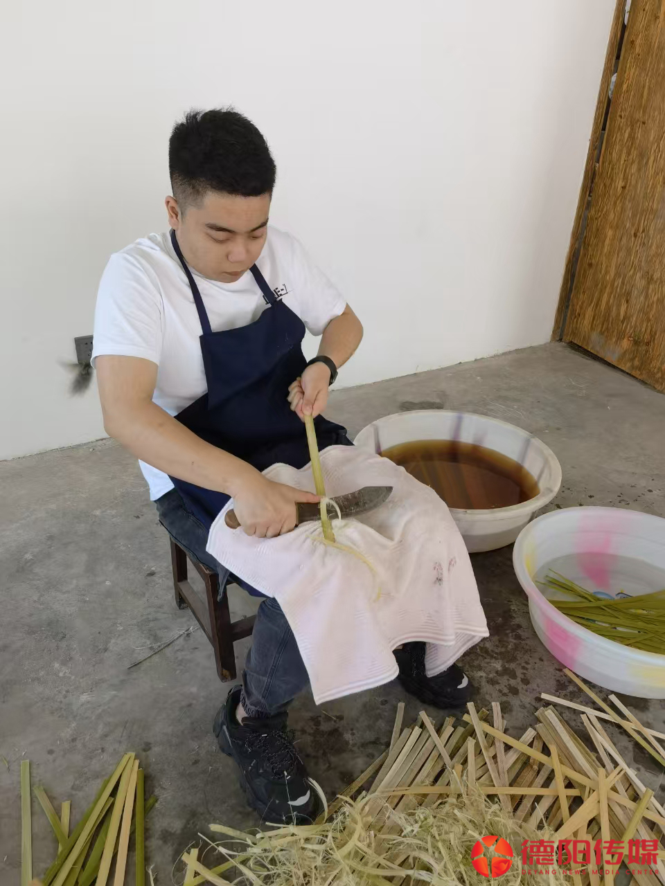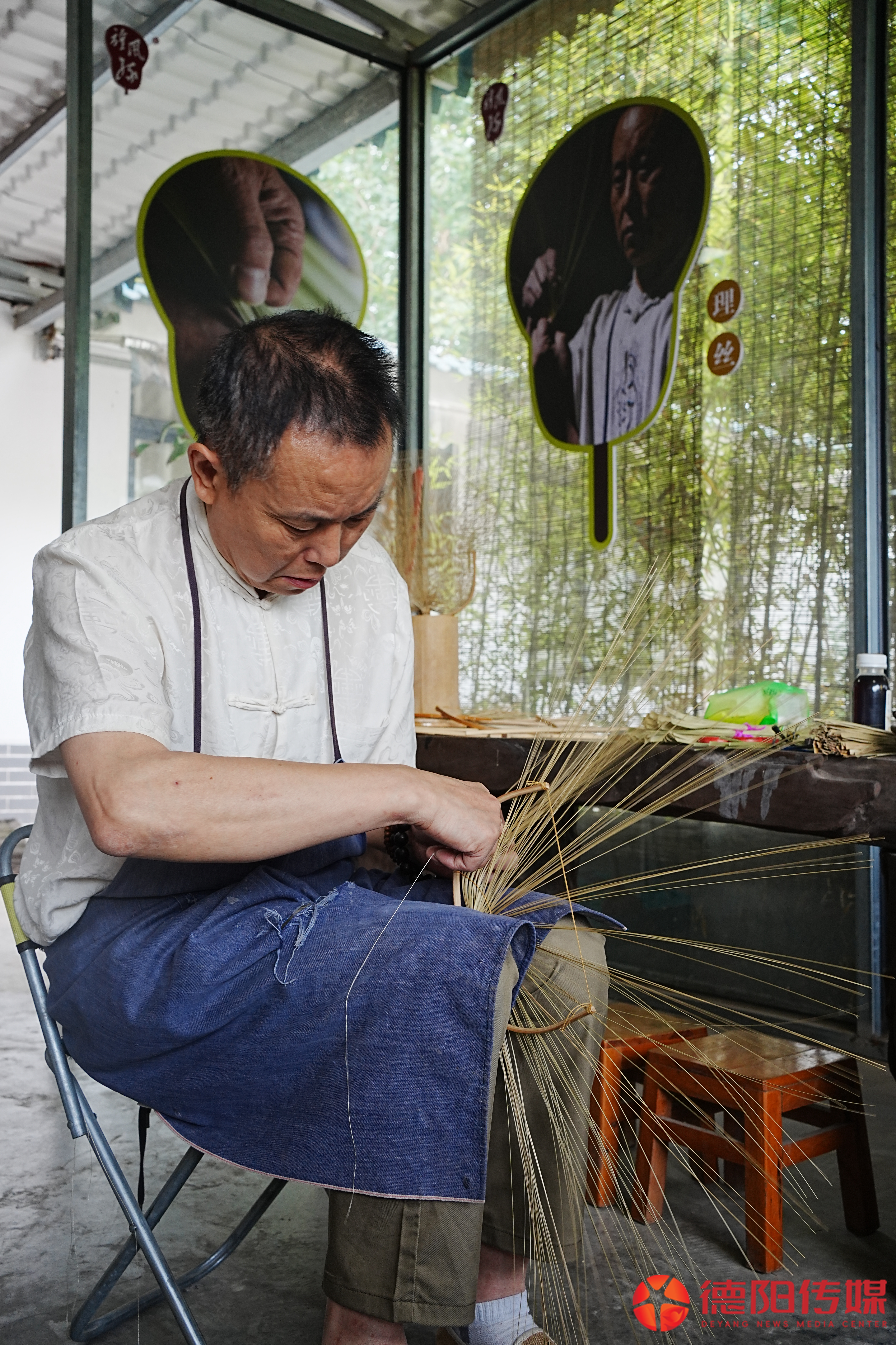 传统的德阳潮扇“以竹为骨,以绢为面,以文为墨,以画为魂”,经选竹、去竹青、劈丝、编织、排线、装裱等18道大工序、50余道小工序,耗时三四日方能完成制作,其繁复的工艺至今无法用机器代替。
