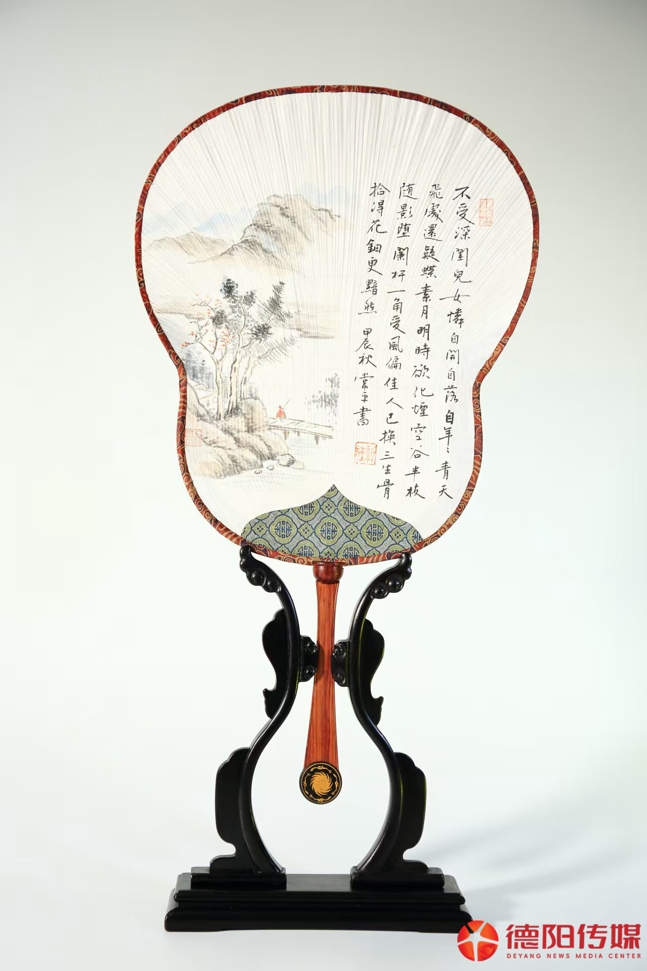德阳潮扇最具特色的当属其在装裱技艺方面的创新。在传统丝绢扇面和手绘扇面的基础上,杨占勇创造性地将蜀绣、蜀锦、年画、竹编画、麦秆画、剪纸等多项非遗元素融入扇面,使一把扇子成为多项传统工艺的集大成者。为顺应时代审美需求,杨占勇还与现代工艺相结合,制作出竹编灯饰、饰品、照片艺术扇等,使德阳潮扇传统工艺更具实用性。而此次非遗节亮相的潮扇更是大胆突破传统,创新采用可拆卸式设计,扇柄与扇面实现自由拆装组合,这种“可定制化”的创新理念精准切中当代年轻人的时尚追求。