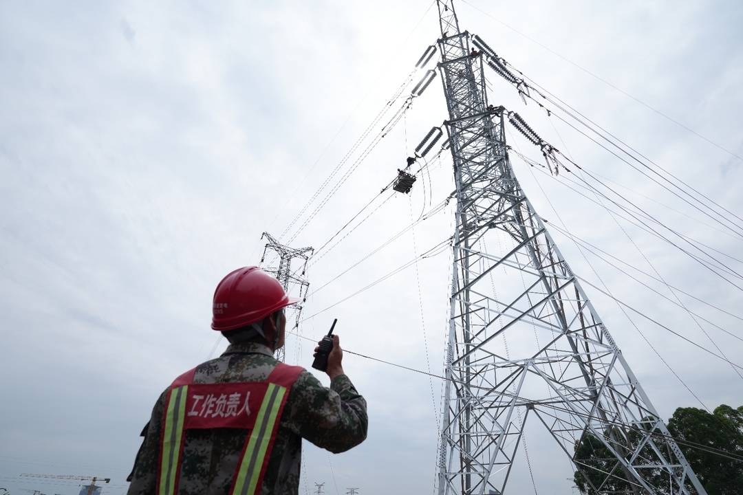 国网天府新区供电公司工作负责人在罗家店—尖山改接大林220千伏线路工程施工现场指挥线路接线工作。(冯一哲 摄)