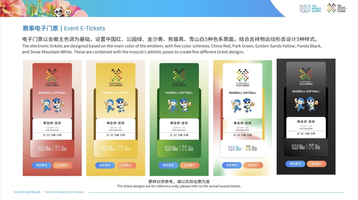 成都世运会比赛门票均以电子门票形式发售,以会徽主色调为基础,设置中国红、公园绿、金沙黄、熊猫黑、雪山白5种色系票面,并结合吉祥物运动形态形成系列主题设计。