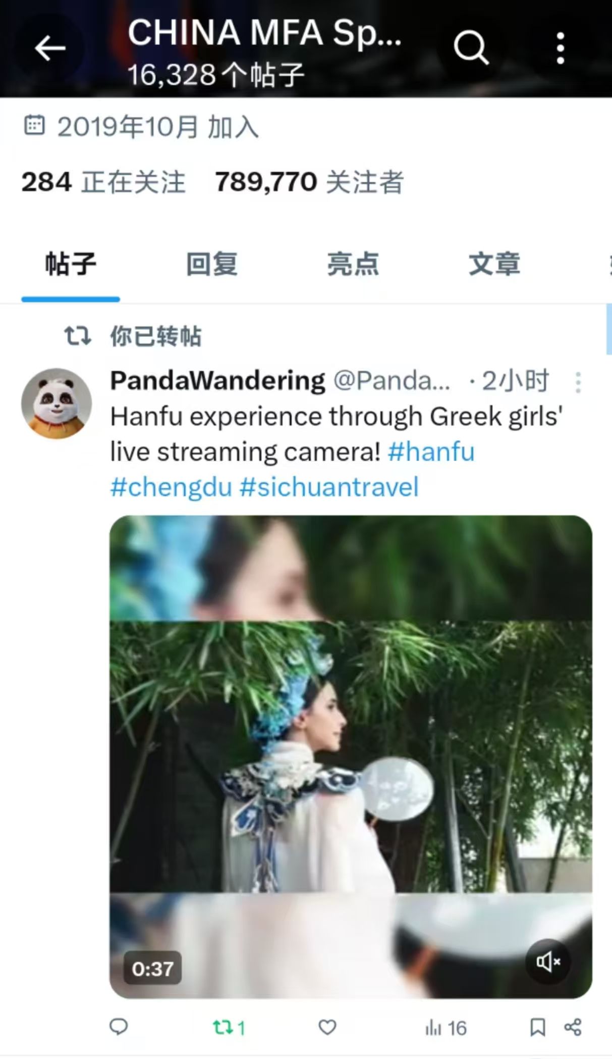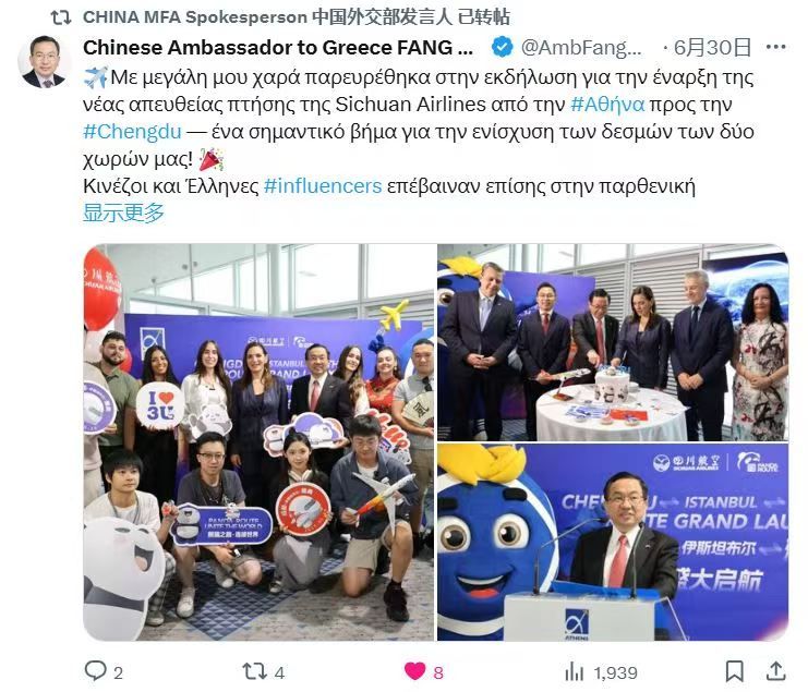 此前,中国驻希腊大使方遒也在X平台发布了成都至雅典航线开通以及欢迎参加“中希网红游名城”相关人员的内容,该条推文也同样被中国外交部发言人账号转发点赞。