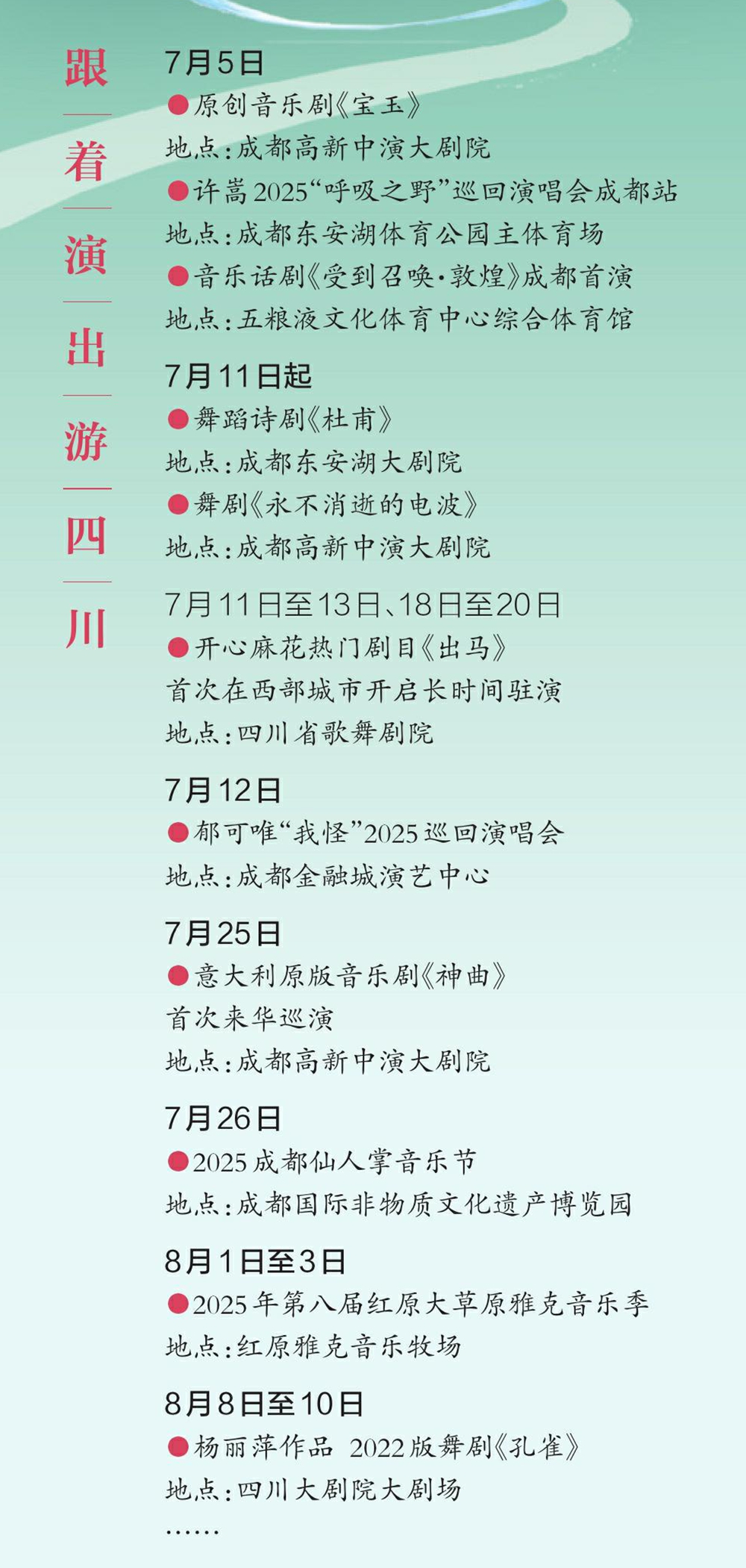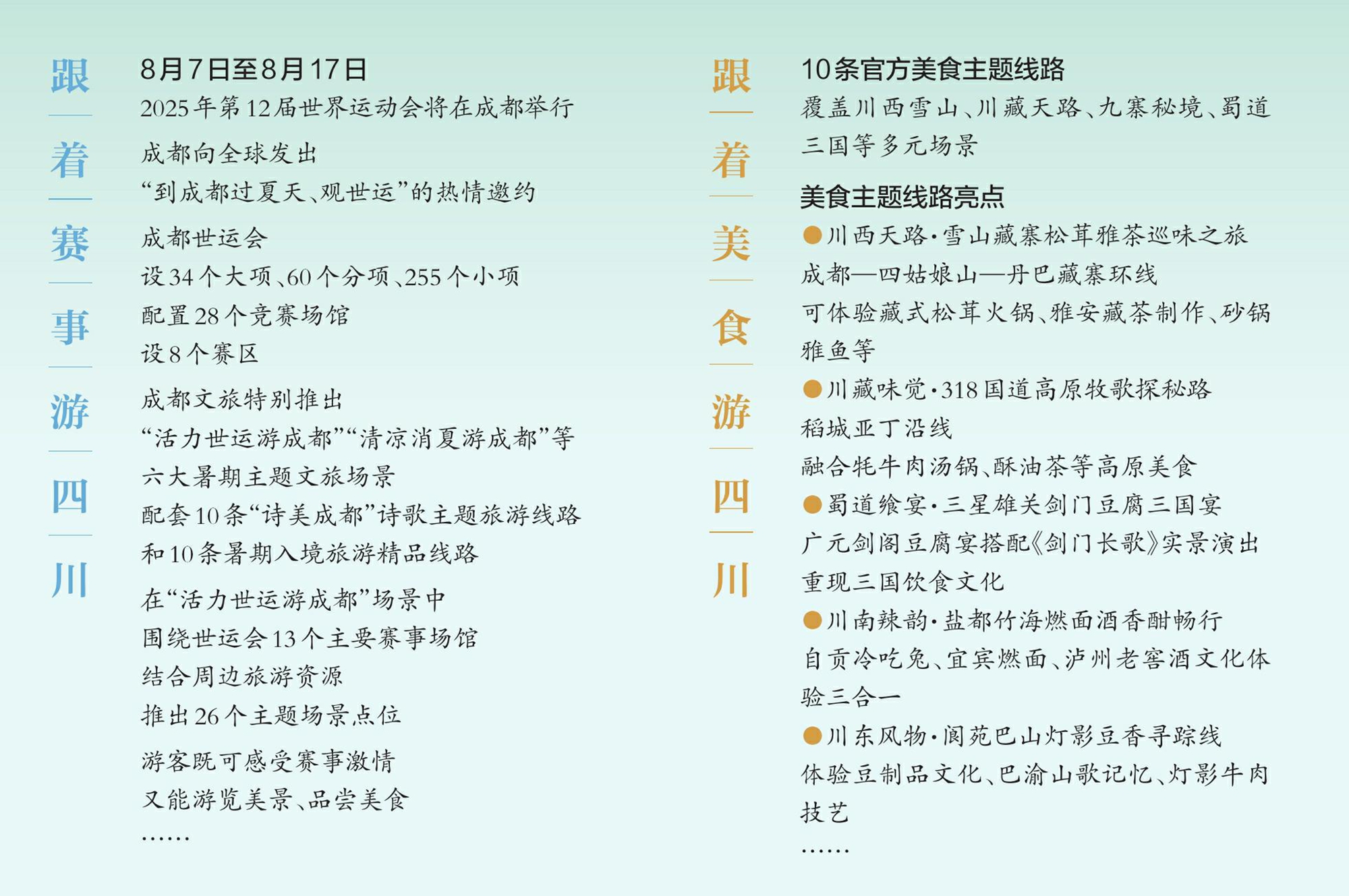 同时,“一城一戏、千幕千场”跟着演出游四川,“天府之国、滋味传奇”跟着美食游四川,“光影镜像、带你入戏”跟着影视游四川等多个主题,进一步深化“文旅+百业”“百业+文旅”,打造更多文旅消费创新场景、品质场景、人气场景,多方发力丰富暑期供给。