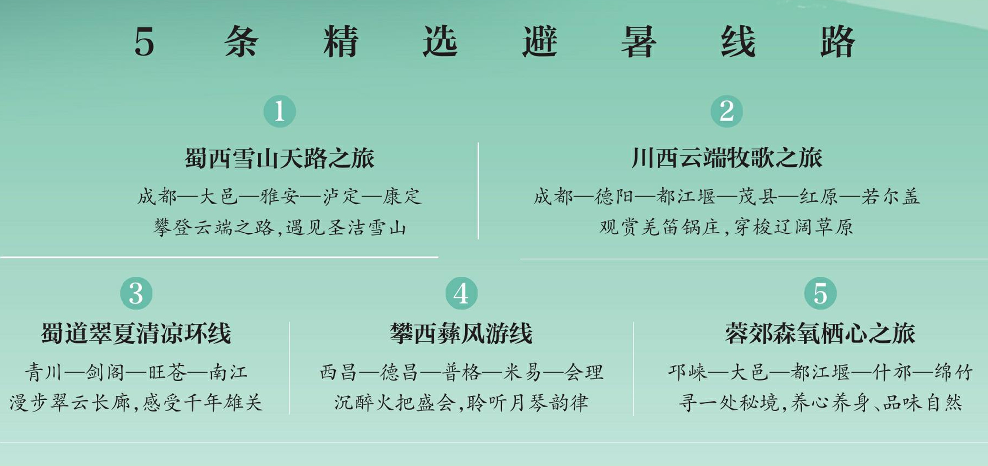 这个暑期,省文化和旅游厅还特别联合省气象局推出5条精选避暑线路,涵盖蜀西雪山天路之旅、川西云端牧歌之旅、蜀道翠夏清凉环线、攀西彝风游线、蓉郊森氧栖心之旅,为游客提供丰富多元的清凉选择。