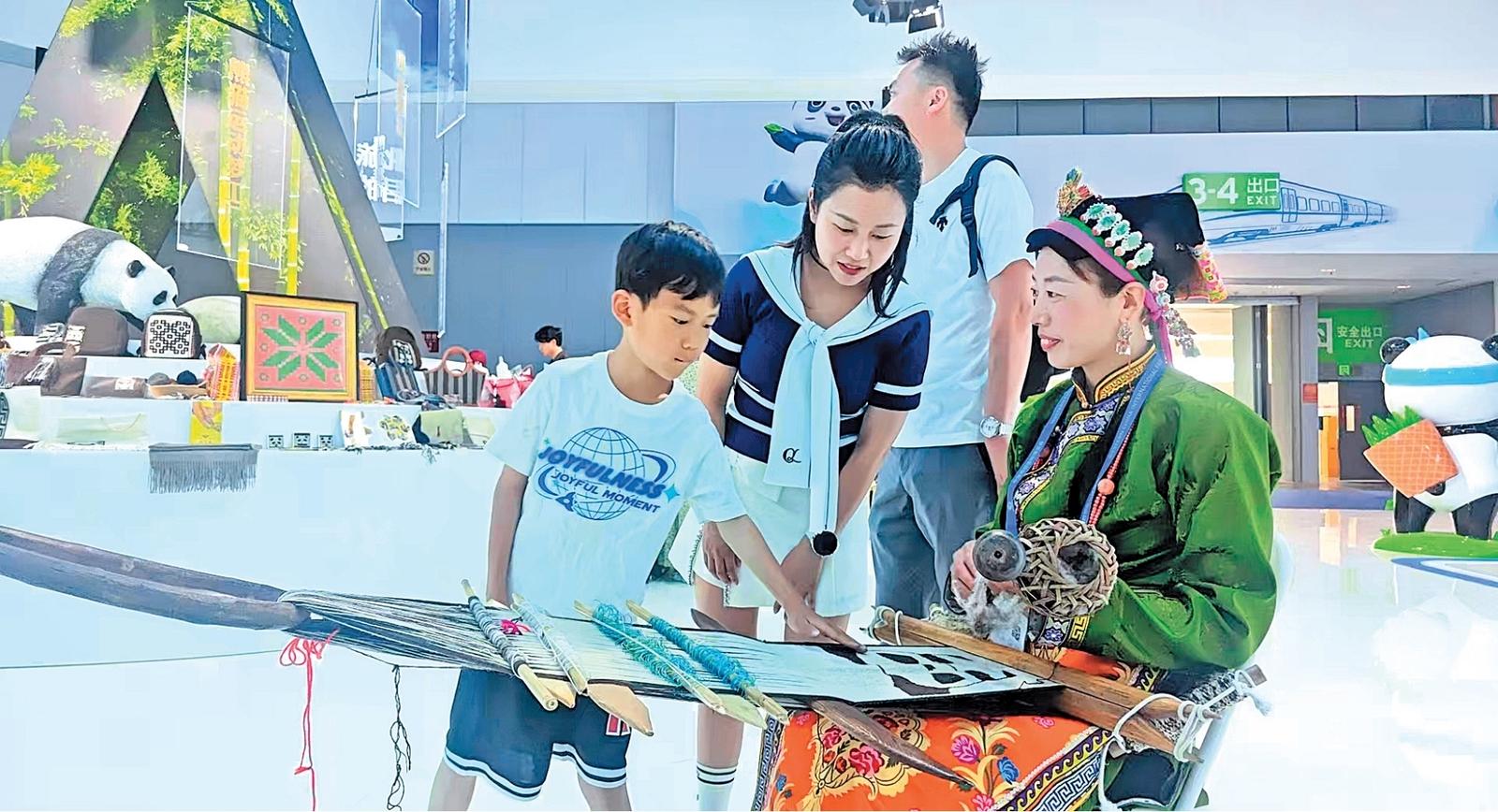 能卡曼(右一)在西博会上设置嘉绒藏族的织布机展示手工工艺