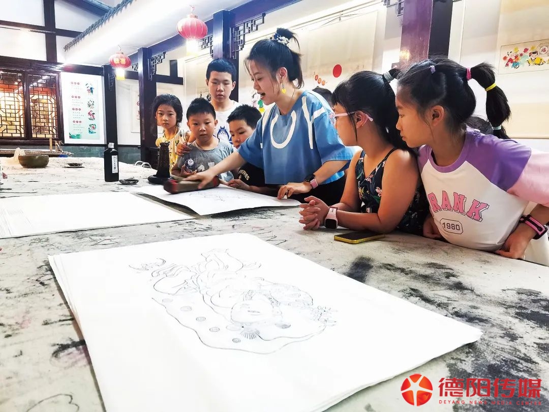 章昉在绵竹年画博物馆向来参观的小朋友讲解绵竹年画的制作技艺。