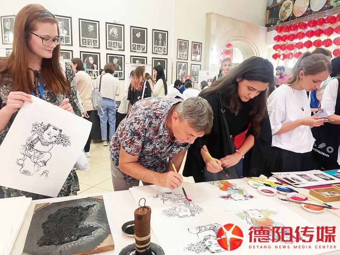 在第九届中俄“长江—伏尔加河”青年论坛“中国日”主题活动中,俄方群众前来体验绵竹年画制作。