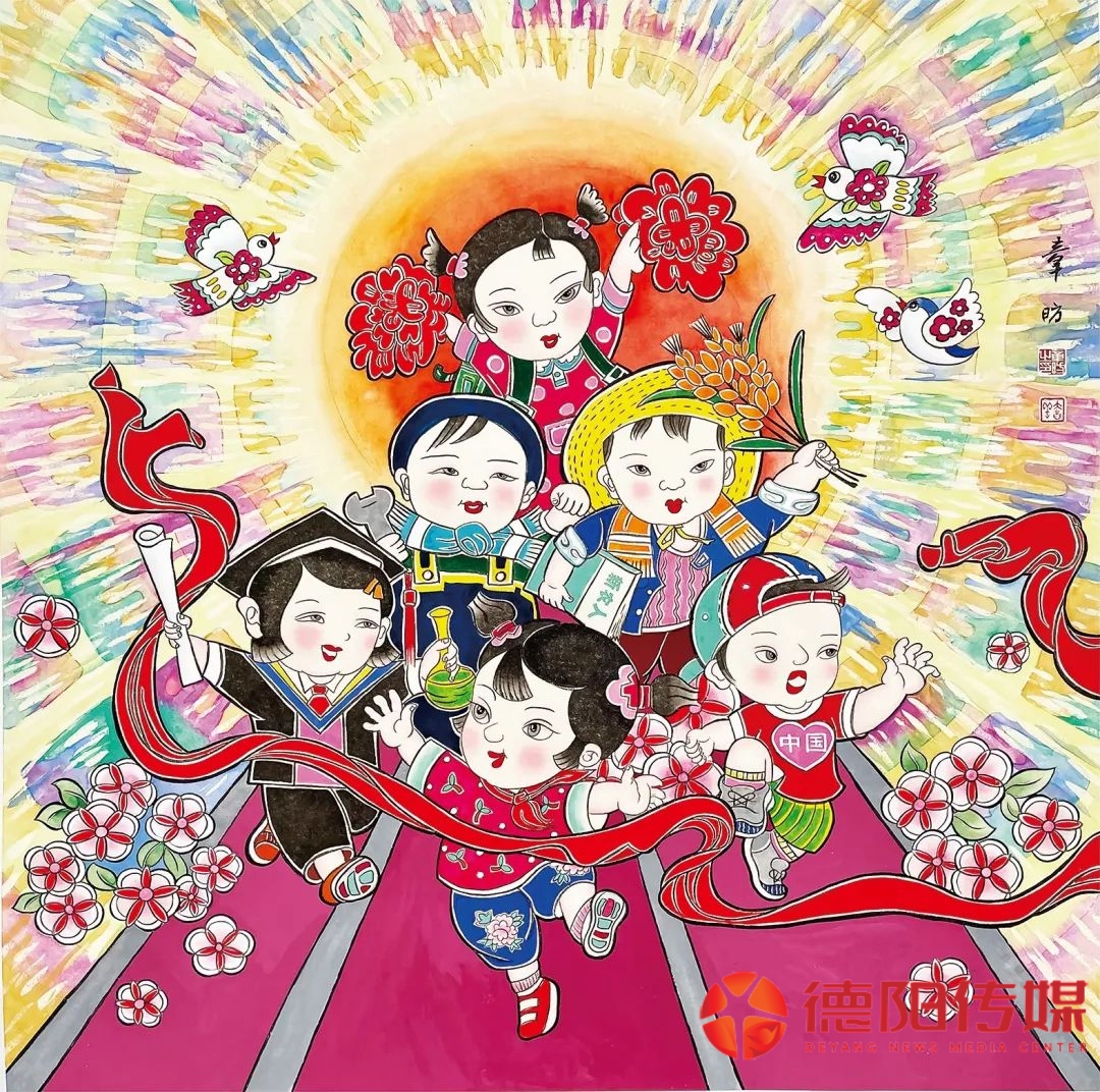在绵竹年画博物馆的大力支持下,章昉在创新的道路上不断探索前进。她不再单纯使用毛笔和宣纸,而是运用数位板和电脑绘图软件等工具,让绵竹年画的绘制插上现代科技的翅膀;除了从传统绵竹年画选取门神、童子、仕女等人物形象外,她把目光投向我们当下的生活。2017年,她与人合作创作年画《姚明来绵竹啦》,一时间让绵竹年画火爆出圈;2020年疫情期间,创作的系列抗疫作品在微信平台广为流传;2024年,她创作《金句——我们都在努力奔跑,我们都是追梦人》,入选中宣部和中国美术家协会主办的“‘新年画、新风尚、新生活’——我们的小康生活”美术展……这些呼应时代热点、蕴含精巧构思的作品,既保持了她“萌年画”的卡通风格,也保留了绵竹年画的基本特征,展示出新时代年画的蓬勃活力。