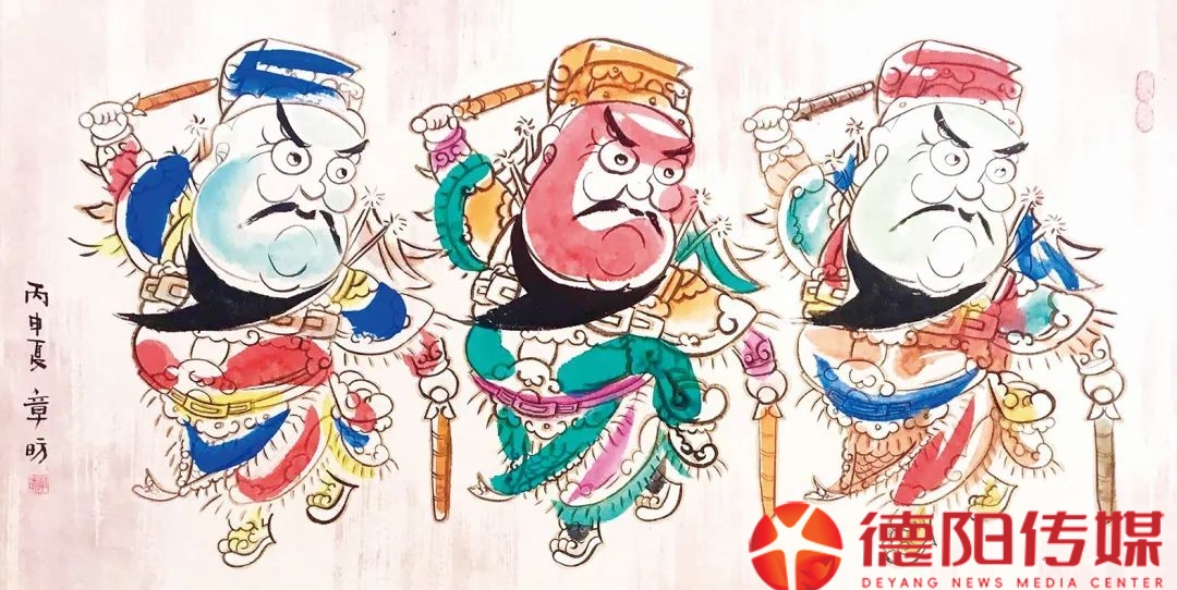 对这款卡通版门神,当时绵竹年画博物馆馆长胡光葵给予了充分肯定,金平定、刘竹梅等老师也鼓励章昉,这样的创新是一个很好的开始。2016年,该作品入选四川省美术家协会、四川美术馆主办的“四川省第八届新人新作美术作品展”;2017年,入选第五届“绵竹市文学艺术奖”。这些成绩的取得,以及前辈老师们的认可,不仅令年轻的章昉增强了信心,也让她有了创作更多“萌年画”的动力。