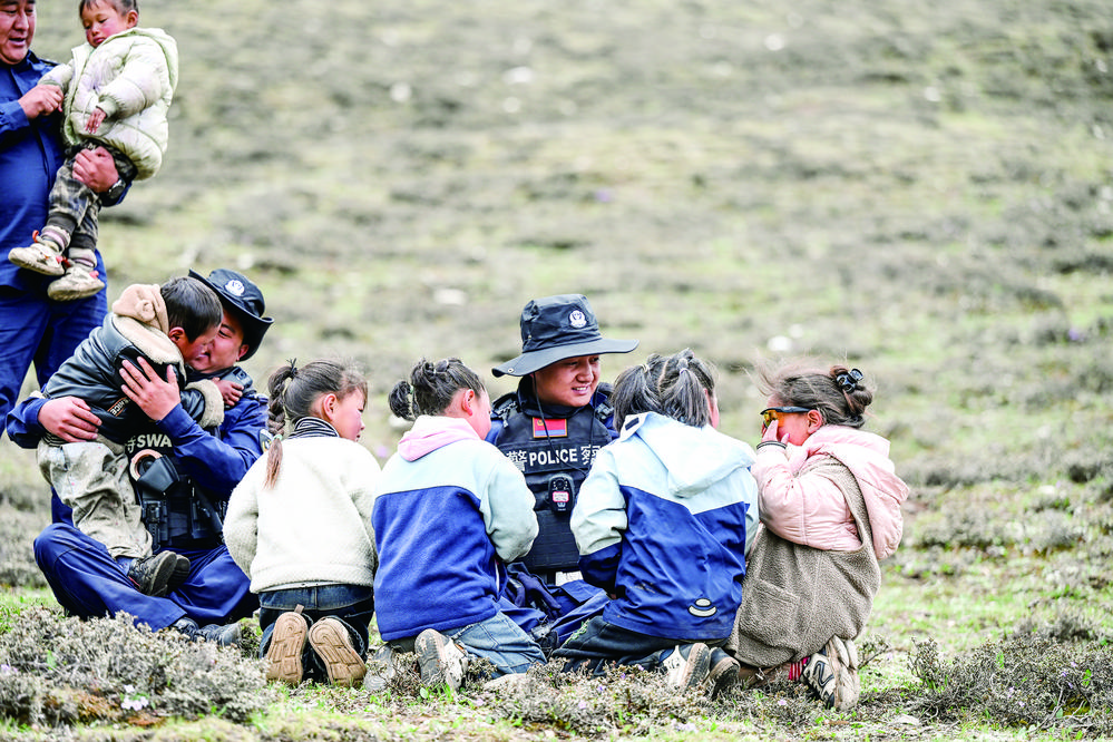 “卓玛!别去河沟边……”话音未落,扎红头绳的孙女已踩着碎石滑进干枯的河道,藏靴踩落的砾石簌簌滚落;双胞胎兄弟在开满狼毒花的草坝上追逐,衣襟被带刺的灌木勾出毛边。拉姆大娘拄着木棍追出帐篷,晨雾裹着的草腥味让她忍不住咳嗽,额间的皱纹都快拧成氆氇结了。“去年邻县的帐篷被棕熊扒开,前年草甸遭遇雷击……”一想到这些,这位年过半百的藏族老人攥紧拳头,浑浊的眼睛里满是焦虑。拉姆大娘拉着执勤民警赵赵的袖子说:“警察同志,娃儿们在草坝上乱跑,我这把老骨头追不上啊。”