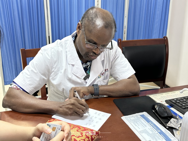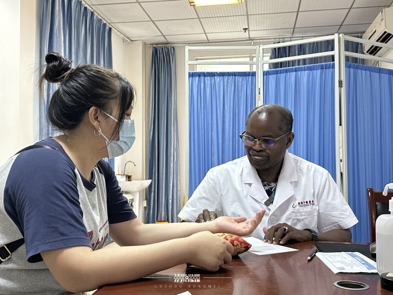 7月8日8时20分,泸州市泸县中医医院门诊部二楼八诊室,一名黑色皮肤、穿着白大褂、戴着眼镜的“洋中医”正在给患者郭纯梅诊脉。一边诊脉,他一边用流利的普通话与郭纯梅交流。“你这情况不能吃阿胶。”“看直播买的?信主播不信医生?”他不仅能说普通话,还听得懂四川话,医患交流毫无障碍。一番望闻问切之后,“洋中医”在一张白纸上写下汉字处方。