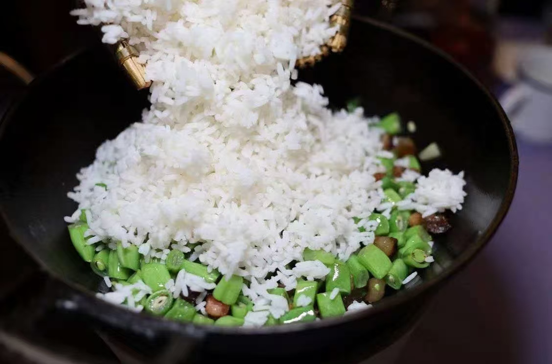 “锅里腊肉颗粒爆出‘滋啦’一声响,土豆、四季豆、胡萝卜粒在油光里跳跃,半熟的大米饭如雪覆盖其上,灶膛文火慢煨,米香与菜香缠绵交融……”在袁博的童年记忆里,这锅凝结着农家巧思的箜饭,是悠悠岁月里最温暖的烟火气。