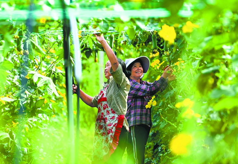 柳滩社区蔬菜种植基地,村民采收丝瓜。
