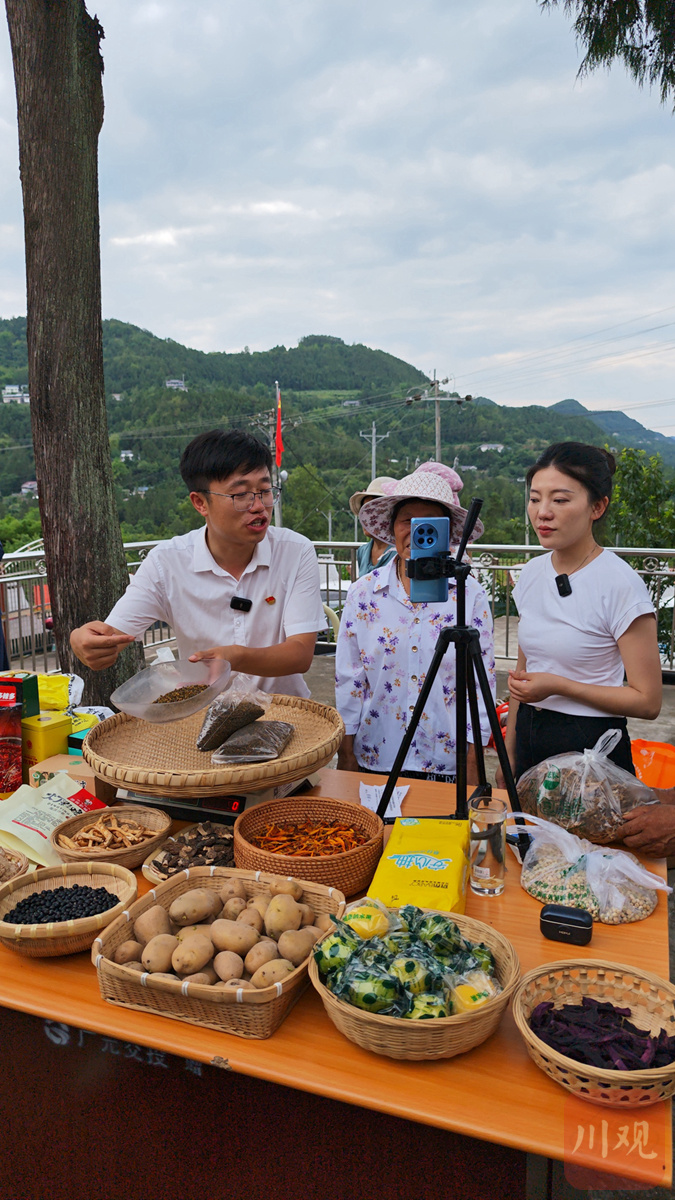 7月3日,我们从成都出发,驱车4个多小时,来到了位于大山深处的苍溪县河地镇兴华村,正好赶上村党支部书记谢艾军在村委会大院做直播。