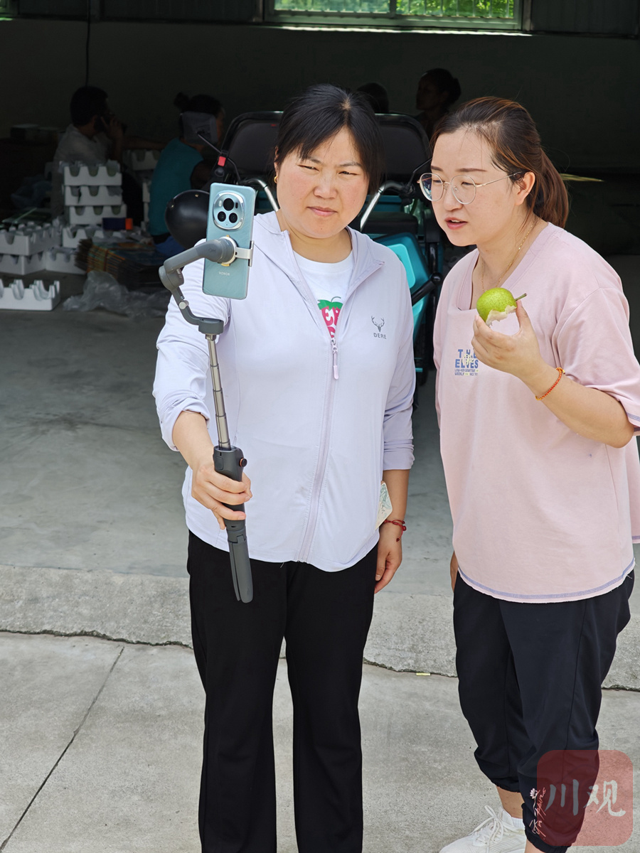 陵江镇笋子沟村党支部书记张桂华(右一)正在直播间销售本地特产翠冠梨。川观新闻记者 陈旻翔 摄