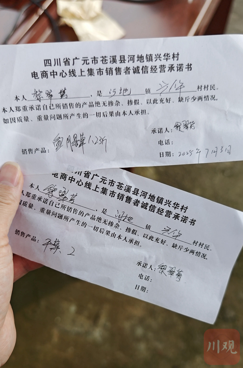 苍溪县河地镇兴华村电商中心线上集市销售者诚信经营承诺书。川观新闻记者 陈旻翔 摄