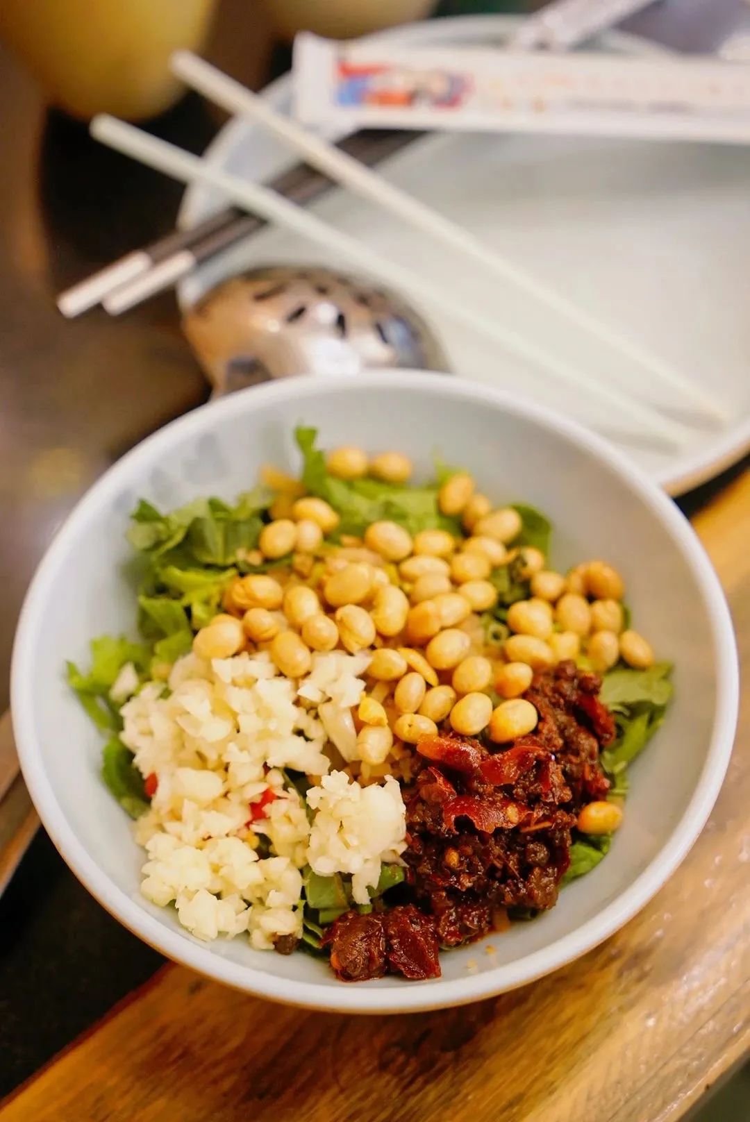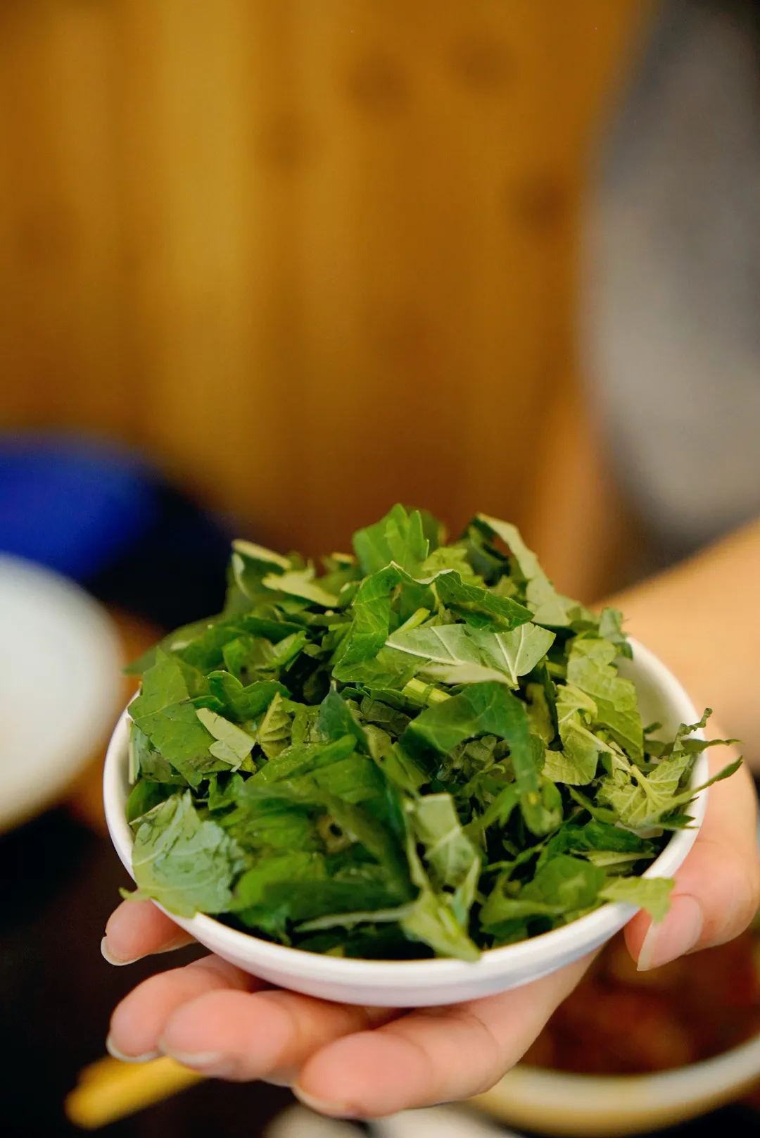 新鲜的藿香被切碎,抓一大把盛放于碗中央,跟黄豆、秘制辣酱、蒜粒等堆叠,就等滚烫的原汤让所有的佐料融为一体。