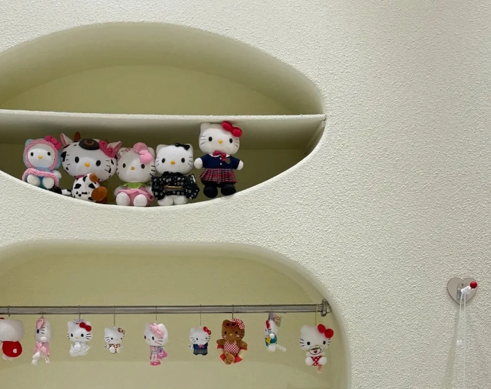 走进店铺,HelloKitty的玩偶、摆件摆满了每个角落,连布丁、蛋糕等甜品上也处处都是Hello Kitty的身影。