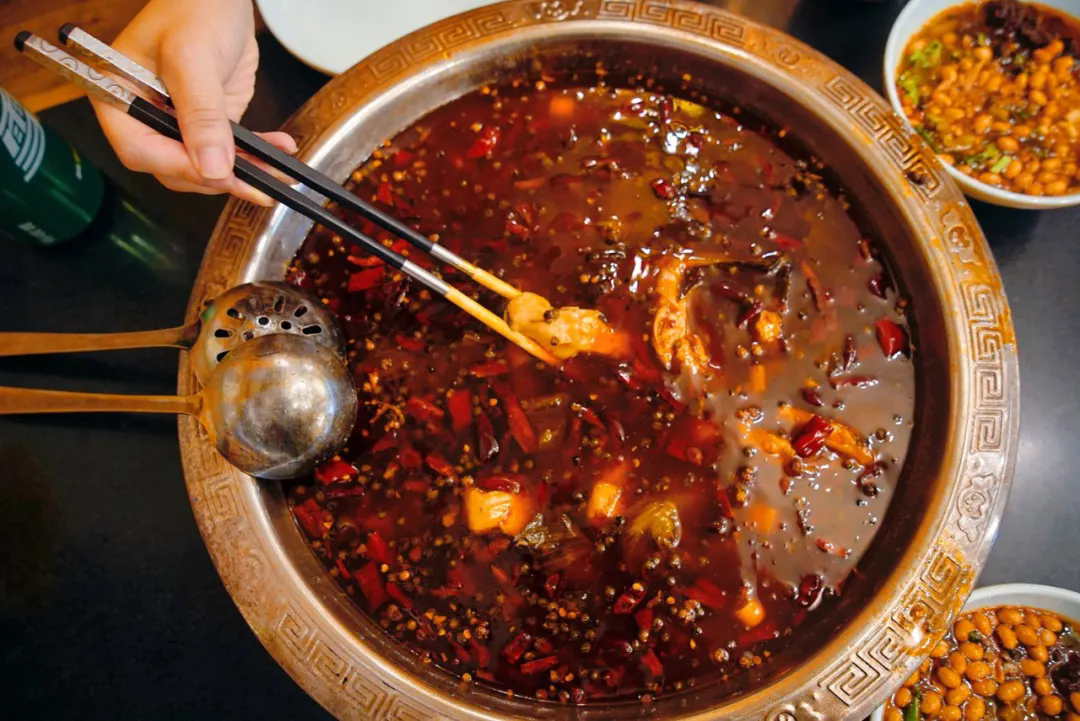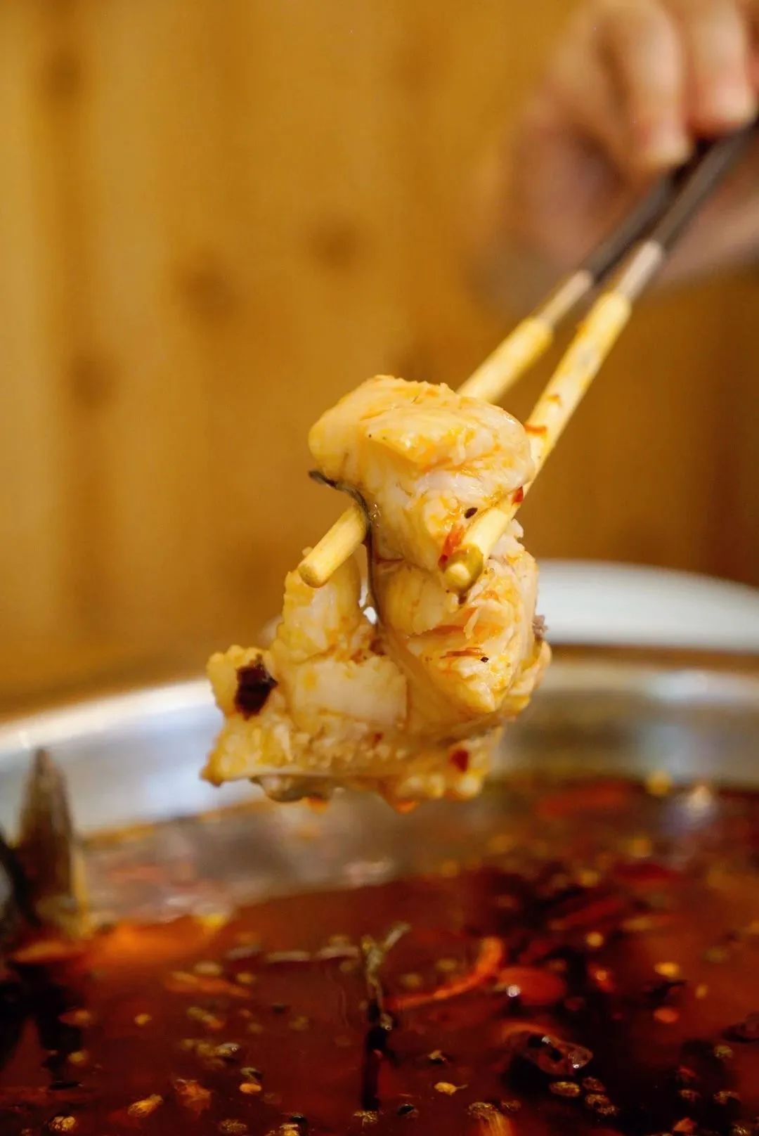 烹饪好后的鱼火锅端上桌,只见锅面漂浮着一层红油和干海椒、花椒,但是入口却并不是想象中那么重口味。鱼肉质紧绷又有弹性,挂上汤水被丢进蘸料,裹上藿香的清香,口舌生津,一切恰到好处、十分温和。
