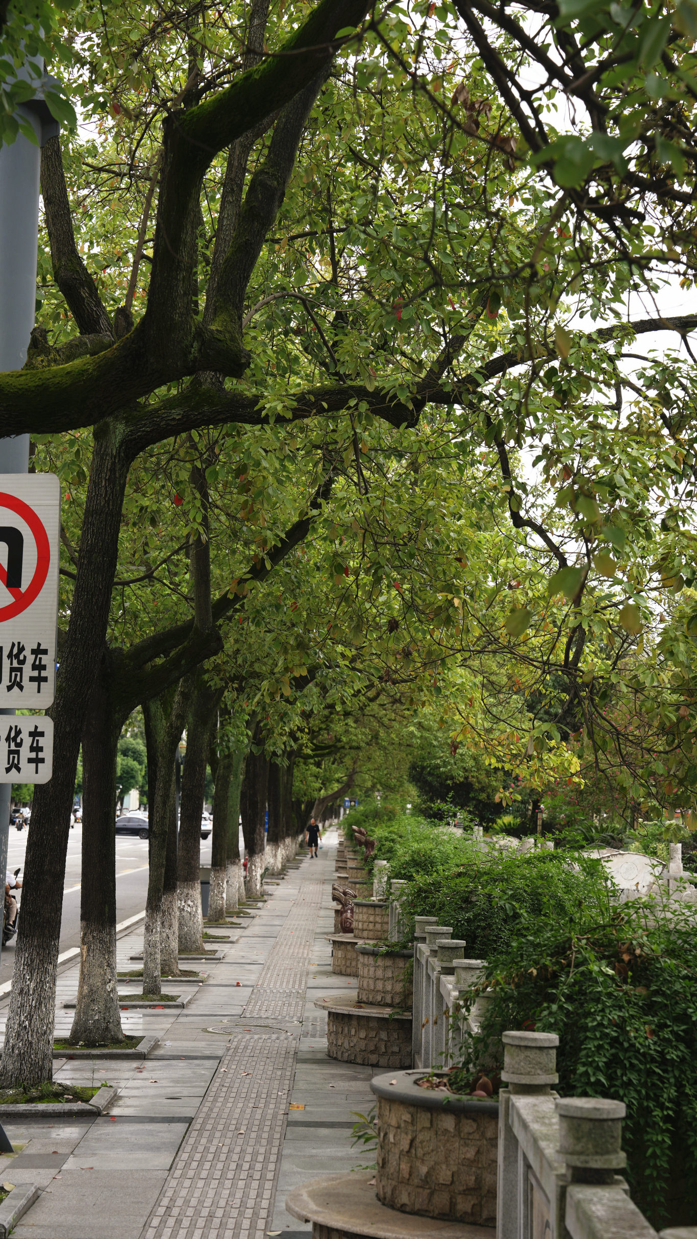 漫步人行道,香樟树的味道扑面而来,粗壮的树干布满青苔,茂密的枝丫撑满道路两旁,时不时还有鸽子和白鹭嬉戏其间。