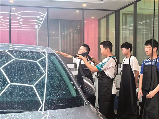 一楼的洗车房里,另一种“慢”正在发生。老师赵磊正用手语比划“高压水枪”的操作步骤,身后的聋哑学生小林攥着水管,水柱忽高忽低地扫过车身。停!赵磊突然打着手势,并指了指不远处的行人,提示小林(化名)注意观察周围环境。教学时,许多细节,赵磊要替学生注意并教给他们。