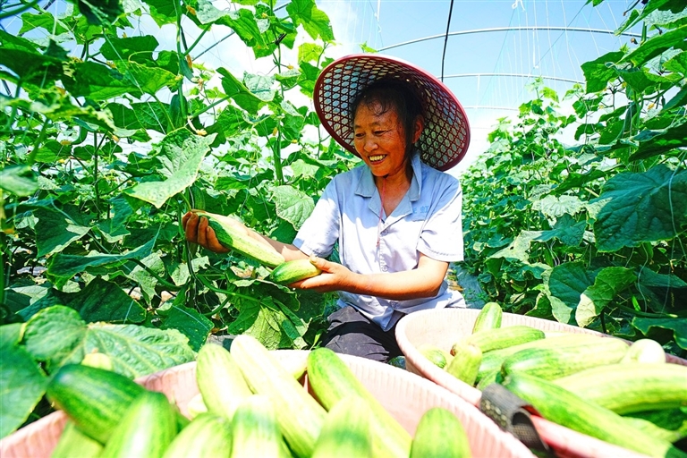 射洪市沱牌镇正豪家庭农场内,村民正在采摘黄瓜。全媒体记者 何飞 摄