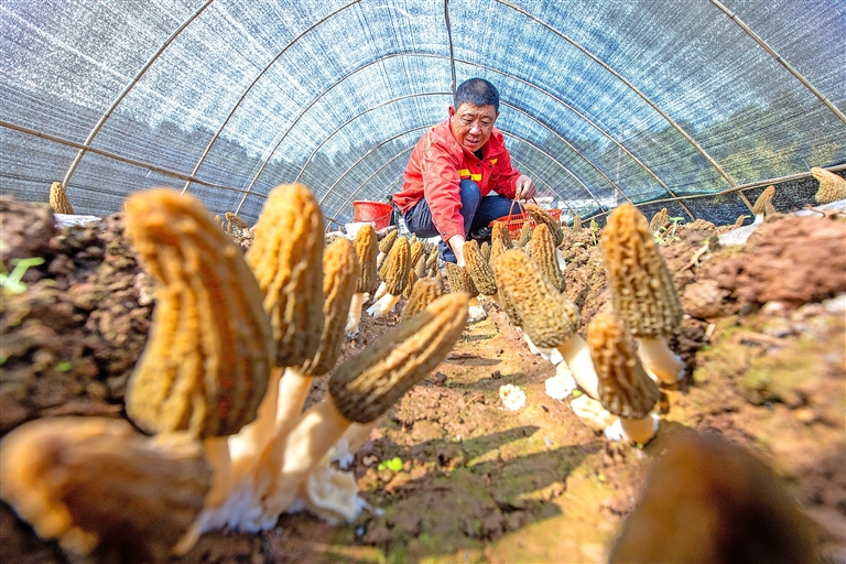船山区永兴镇花果村,种植户在大棚里采收羊肚菌。全媒体记者 吴奉家 摄
