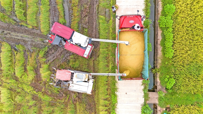安居区三家镇土祠村,种植大户组织抢收水稻。 全媒体记者 吴奉家 摄