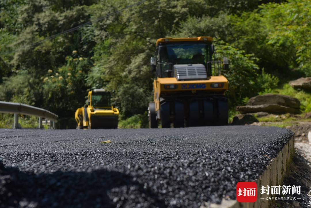 2019年7月27日,国道351线硗碛至夹金山公路改造工程,工作人员正在铺设沥青。摄影:杨涛