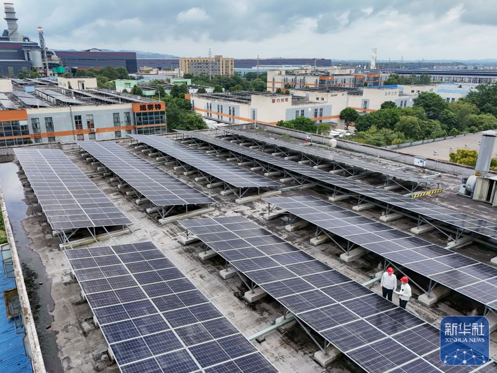 在四川都江堰经济开发区,朱鹏宇(左)和同事检查工业用户新装屋顶光伏板(无人机照片)。