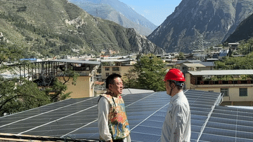 在四川省汶川县威州镇,朱鹏宇(右)在居民用户屋顶光伏安装施工现场对光伏板安装情况检查。
