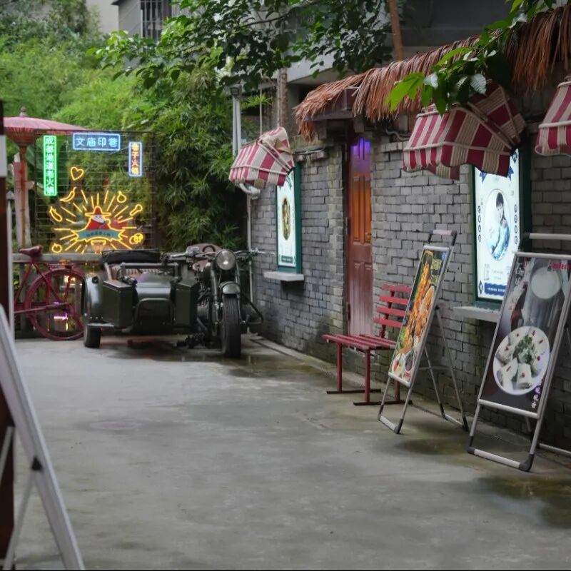 招牌不只是商业符号,更是城市文化的“微型博物馆”。老厂房变身文创潮流园区,温江朋克公园巧妙延续工业记忆,园内“来咖啡”的招牌设计,在复古中蕴藏青春气息,形成强烈视觉冲击。